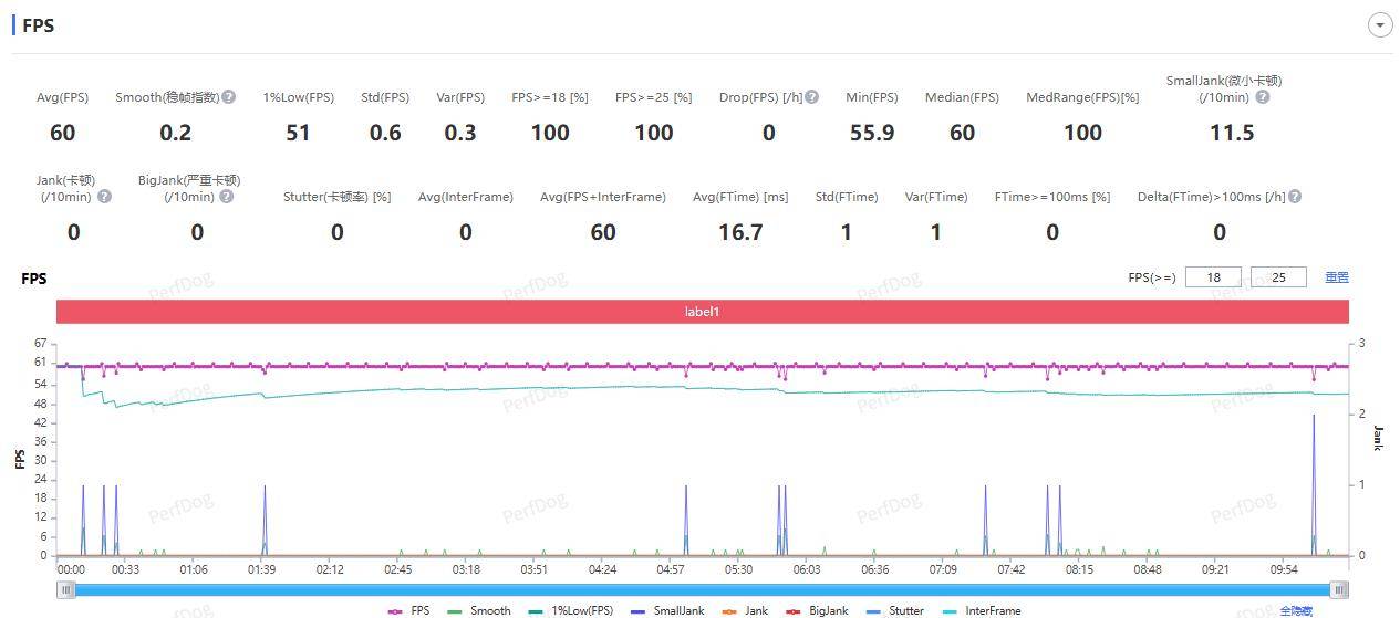 跑图 10 分钟后,测得游戏运行平均帧率为 60 FPS,整个过程也没有遇到卡顿掉帧的情况,帧率曲线上几乎没什么波动。