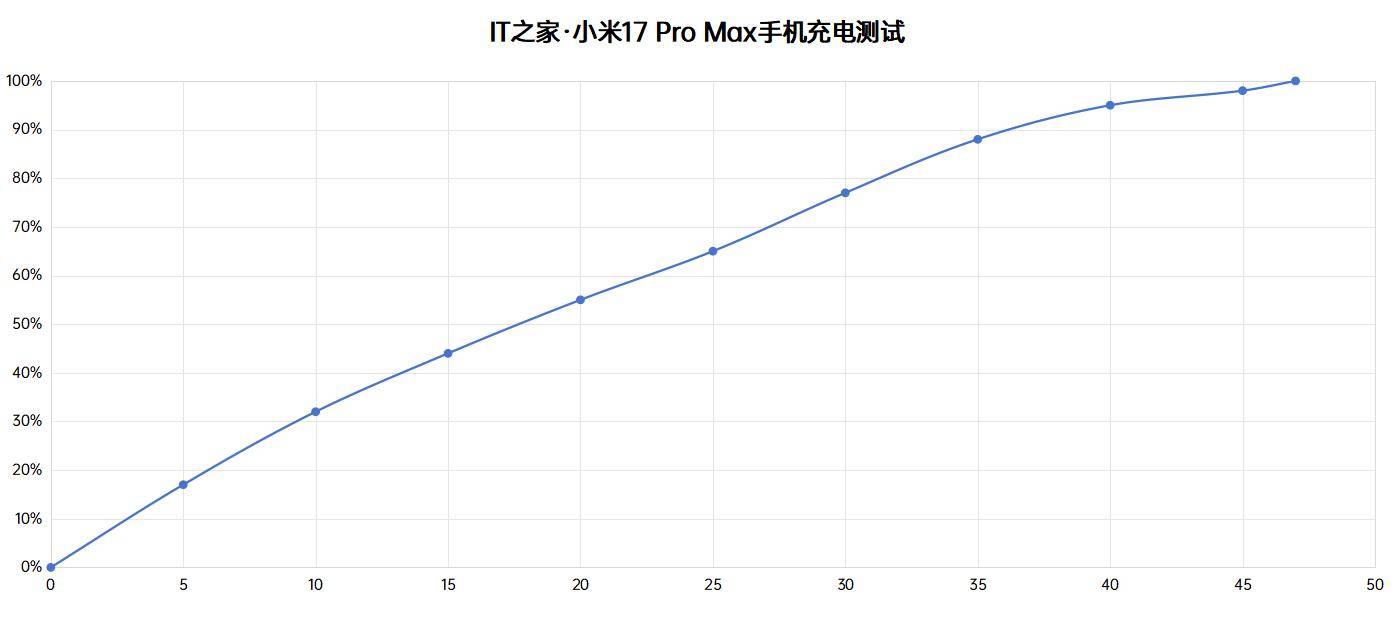 充电方面,IT之家也对这两款手机分别做了充电测试,充电时手机初始电量为 0%,使用标配的 100W 充电器,20 分钟可充到 55% 的电量,充满电花了 47 分钟。